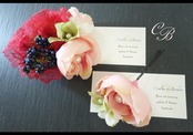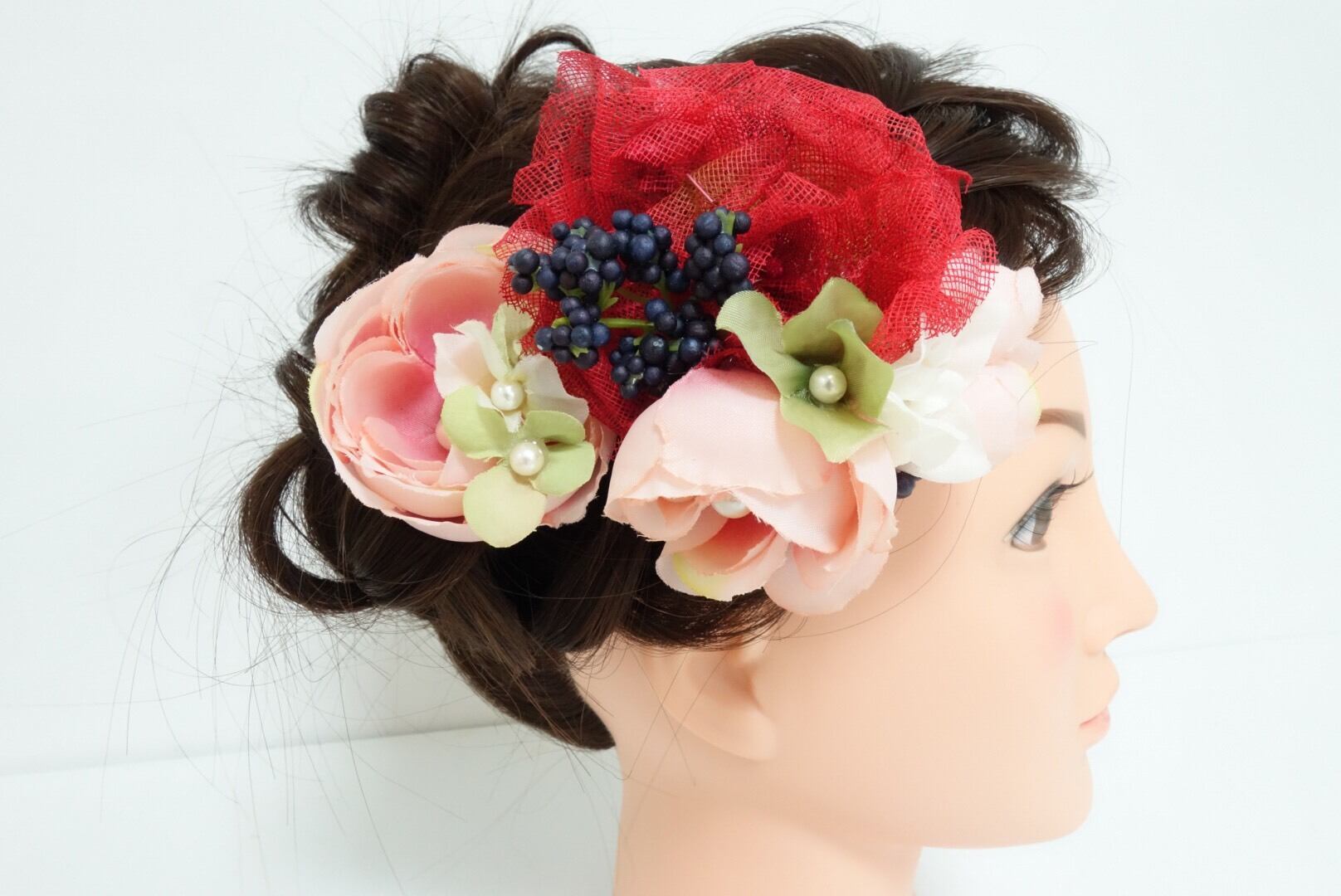 赤紅(あかべに)×純白×朱鷺色(ときいろ)×若緑×黒紅梅のフラワーアート花飾り。