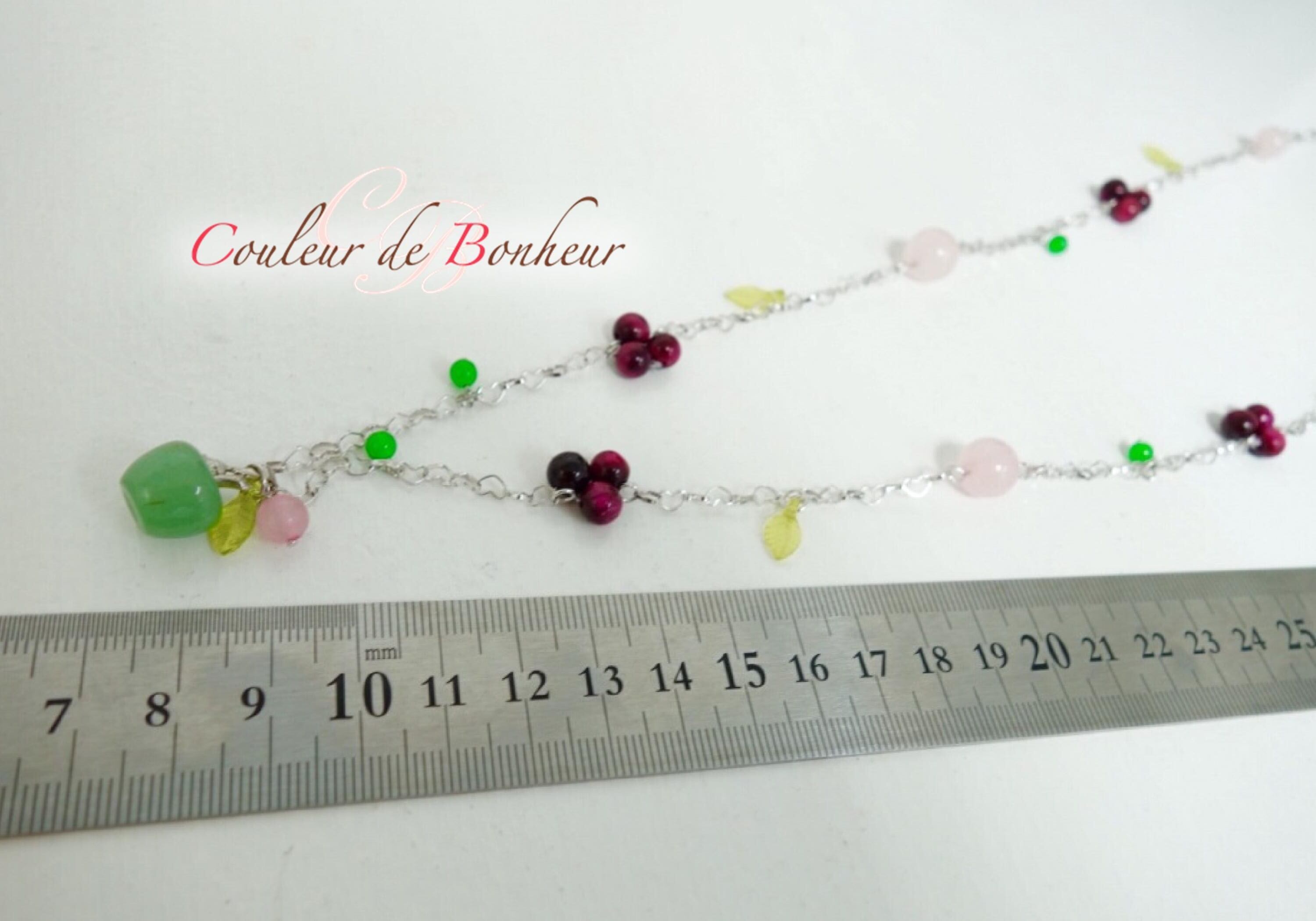 コロンとしたインドヒスイの青りんごや、ミックスベリーをイメージした天然石を組み合わせ大人の遊び心を演出。