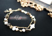 珍しい淡水パールのクロスモチーフを中心に、ライトニング水晶やニュアンスカラーの小粒淡水パールを施し、優しく洗練された印象のブレスレットに仕上げています。