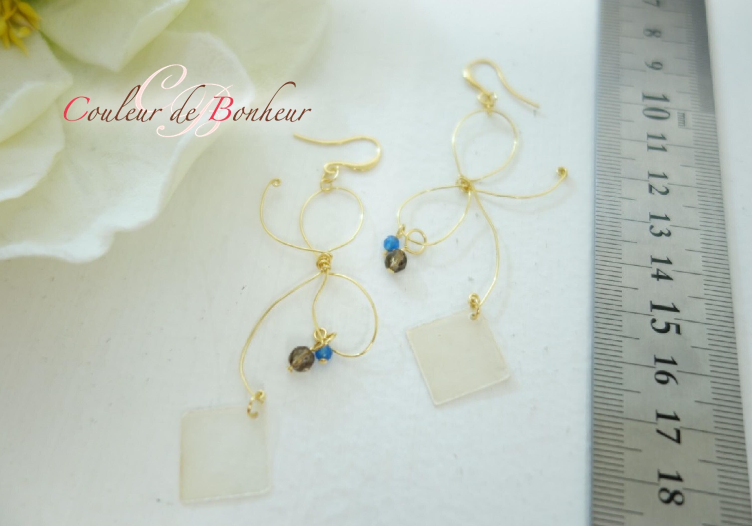 ワイヤーリボン×スクエアシェル天然石ピアス